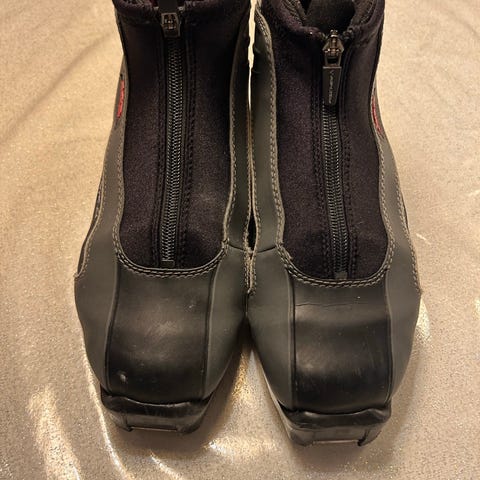 Madshus CT 100 langrennsstøvler i størrelse 41. Støvlene er svarte med glidelås og klaff over vristen. De har myk innside for økt komfort og forsterket tåparti. Sålen er tilpasset langrennsbindinger (se bilder for detaljert såletype). Egner seg til klassisk langrenn og turbruk.