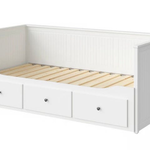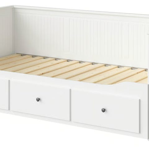 Selger en Ikea seng/dagseng, i hvit med 3 store skuffer til oppbevaring. Denne sengen kan dras ut til dobbeltseng. Det kan følge med en madrass hvis ønskelig.