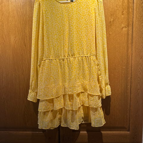 sommerkjole for dame i størrelse M. Kjolen er gul. blomsterpreg