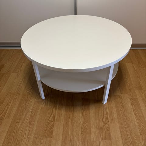 Pent brukt rundt sofabord i hvit utførelse selges. Bordet har en praktisk underhylle som gir ekstra oppbevaringsplass til bøker, magasiner eller fjernkontroller.