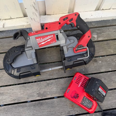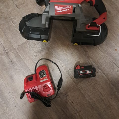Milwaukee båndsag batteridrevet. Kompakt, håndholdt båndsag egnet for kapping av metallprofiler, rør og andre materialer. Utformet med ergonomisk håndtak og beskyttelseshus rundt bladet for bedre kontroll under arbeid. Drives av oppladbart batteri (batteri og lader kan være nødvendig separat, avhengig av variant). Passer for både profesjonelle og hobbybrukere som trenger en mobil båndsag til arbeid på verksted eller byggeplass.