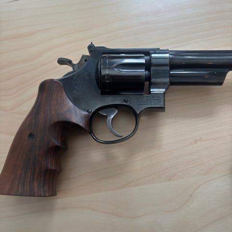 Pen Smith&Wesson revolver med 6" løp, cal 22 selges kr 6.000, ferdig prutet