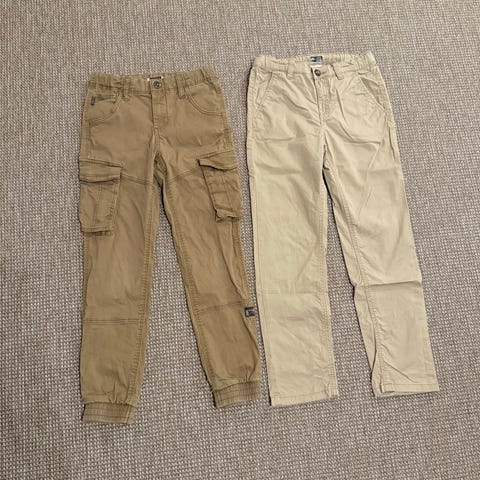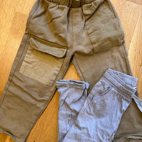 Zara bukse for gutt i størrelse 116. Buksene har elastisk linning og er i ulike jordfarger som grå, brun og beige. Passer til hverdagsbruk for barn. Et bukser har slitasje på rumpa, se bilde. Første bukse fra venstre ble aldri brukt.