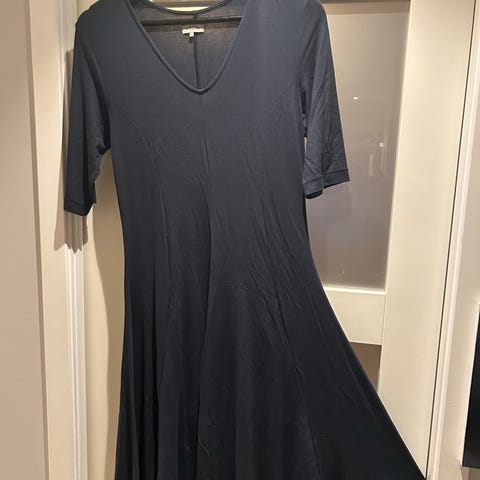 byTiMo hverdagskjole for dame i størrelse L. Kjolen er svart med blomstermønster og laget i viskose. Den har lange ermer med strikkdetaljer ved mansjettene og rund hals. Åpning og lukking bak i nakken. Passer som hverdagskjole eller til enkle anledninger.