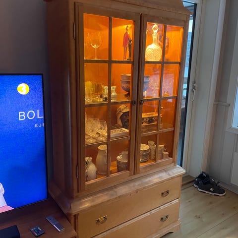 vitrineskap i heltre furu. Skapet har to sidevinduer med glass og belysning, samt hyller til glass og servise. Midtseksjonen har flere skuffer og et skap med nedfellbar klaff som kan brukes som liten arbeids- eller serveringsflate. Øverst er det speil og en overdel som kan brukes til dekor. Passer til oppbevaring av servise, glass, bestikk og andre gjenstander i stue eller spisestue.