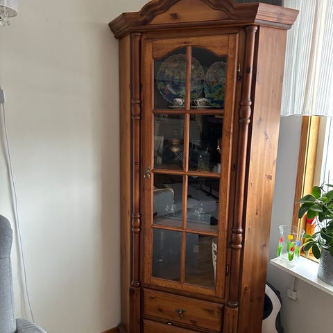 vitrineskap i heltre furu med speil inni