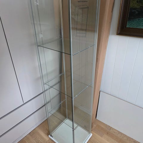 Pent vitrineskap fra IKEA. Følger ikke med lys. Må hentes på 3170 Sem.