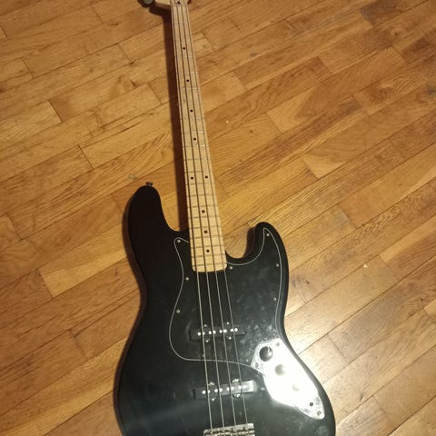 Fender Squier Jazz Bass elbass. Modellen har klassisk Jazz Bass-kropp med to single-coil pickuper og standard kontrolloppsett med volum- og tonekontroller. Kroppen har rød sunburst-finish med plekterbrett i mørk tortoiseshell-stil. Halsen er i lys treverk med bolt-on konstruksjon og gripebrett med båndmarkeringer. Stemmeskruene er i krom og plassert på én side av hodet. Passer til elbass-spill i ulike sjangre, både øving, band og opptak.