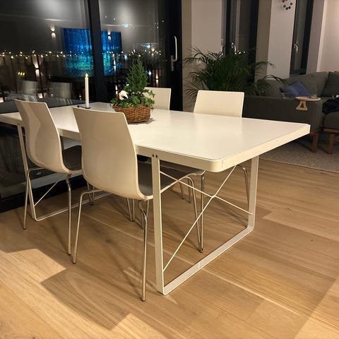 Høyde kan enkelt justeres fra 60-90 cm, ved å kun skru på føttene. Føttene er markert med ulike nivåer for enkel tilpasning i vater. Knapt brukt, har stått på gjesterom.