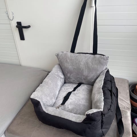 Bilsete for hund i svart/grå. Setet har polstret innside og bunn for økt komfort, integrert selefeste for å feste hundens sele under bilkjøring. For for mindre hunder.