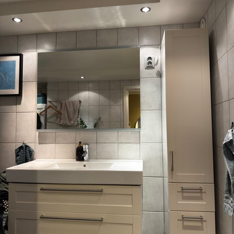 Baderomsinnredning i klassisk stil bestående av hvitt servantskap med integrert servant og fire dører, samt tilhørende høyskap med dører og skuffer. Frontene har profilerte fyllingsdører og runde knotter. Høyskapene har nederste del med skuffer og øvre del med skapdører for ekstra oppbevaringsplass. Innredningen passer til bad med behov for god lagringsplass til toalettartikler, håndklær og annet baderomsutstyr.