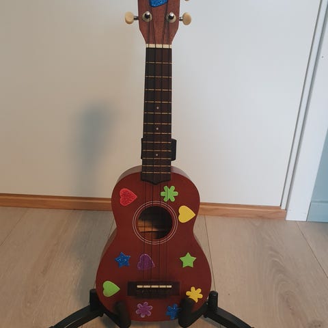 Liten gitar med flamme-motiv. Merke er ukjent og passer best til et lite barn.