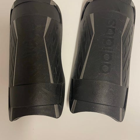 Adidas leggskinn i hvit farge med blå detaljer. Skinnene er formet for å dekke leggen og har mønster i overflaten for bedre passform og støtdemping.