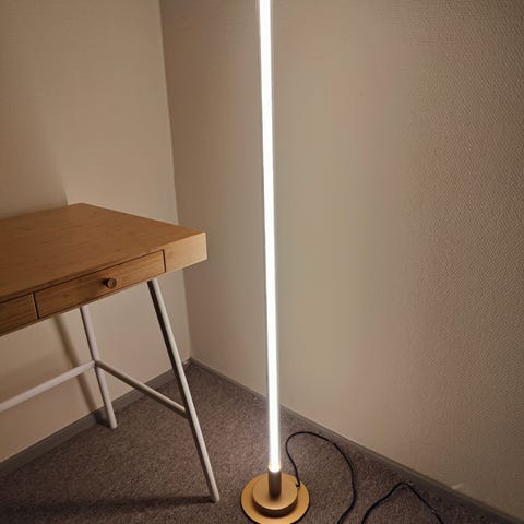 Selger en flott, håndlaget vegglampe i moderne design. Lampen er laget av meg selv med fokus på detaljer og kvalitet. Den består av trelekter (spiler) montert på en sort bakplate, noe som gir en stilig kontrast og et rustikk, men moderne uttrykk.