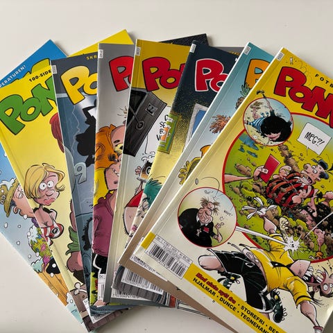 Pondus tegneserieblader samling. Flere hefter med fargerike omslag og humoristiske striper. Inneholder historier med kjente figurer fra Pondus-universet. Egner seg for lesing, samling eller som tilskudd til eksisterende tegneseriesamling. Samlet kr 100