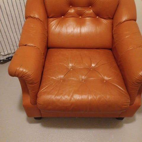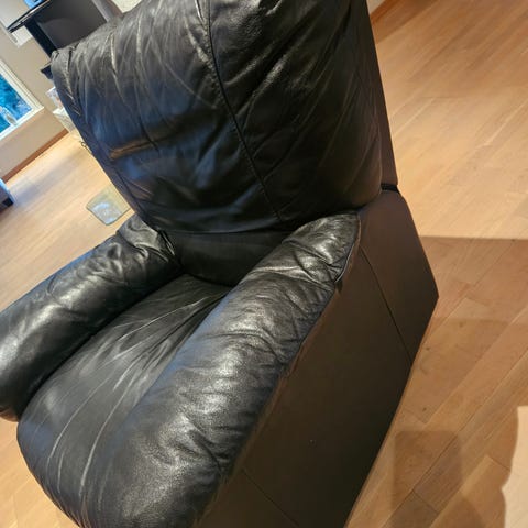Liggestol i skinn imitert skinn gis bort. Fin i skinnet. Sliten pute og falm på kanten (stoffet under skinnet) hentes på Lura