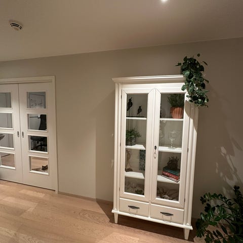 Pent og smalt vitrineskap selges.