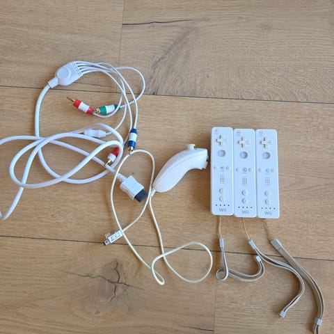 Nintendo Wii tilbehørspakke med strømadapter, sensorbar og kompositt AV-kabel i grå farge. Strømadapteren kobles mellom Nintendo Wii-konsollen og stikkontakt. Sensorbaren plasseres foran eller under skjermen og kobles til konsollen for registrering av Wii-fjernkontroller. AV-kabelen har tre RCA-kontakter (gul video, rød og hvit lyd) for tilkobling av Nintendo Wii til TV med komposittinngang.