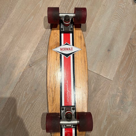 aloiki longboard i rød og svart farge. Brettet har avlang form med avrundede ender og trucker og hjul montert for cruising og pendling. Oversiden har svart griptape med aloiki-logo, undersiden har fargeovergang fra rød til mørk med grafikk. Egnet for bruk på asfalt og jevne underlag.