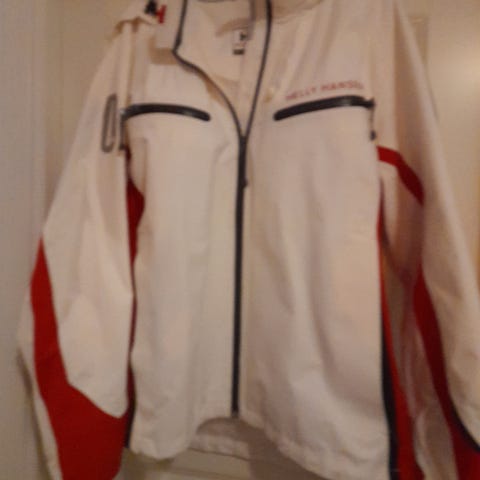 Stormberg regnjakke for dame i størrelse S. Jakken er hvit med mørke kontraststriper. Materiale i polyester. Modellen har hette med snøring og hel glidelås foran. Praktiske lommer i front.