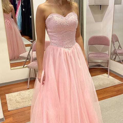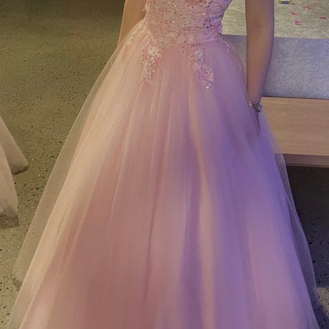 Alexandra Ritzi kjole størrelse 34. Kjolen er rosa med stroppeløst liv, dekorert overdel og voluminøst skjørt i flere lag tyll. Tilpasset høyde 1,65. Passer til anledninger som feks ball.