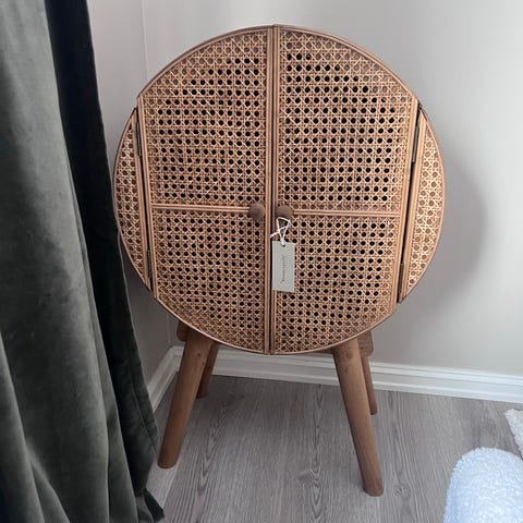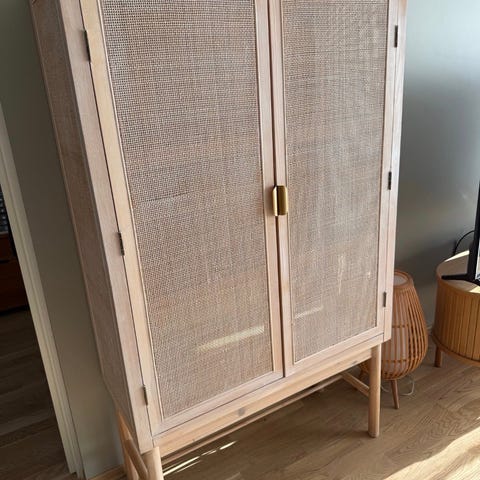 Skapet er laget i FSC®-sertifisert furu og har flettede rattandører med et lett, halvgjennomsiktig uttrykk som gir rommet en lun og innbydende stemning.