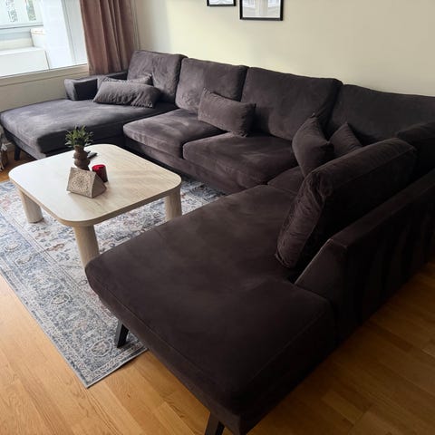Sofa selges rimelig Noe falming og en skade under venstre sjeselong gir lite knirk om man setter seg en spesifikk plass, men mye bruk igjen i denne gode sofaen. Putetrekk kan tas av, disse ble vasket for 1 måned siden. To hodestøtter og ubrukt endedel til venstre følger med.