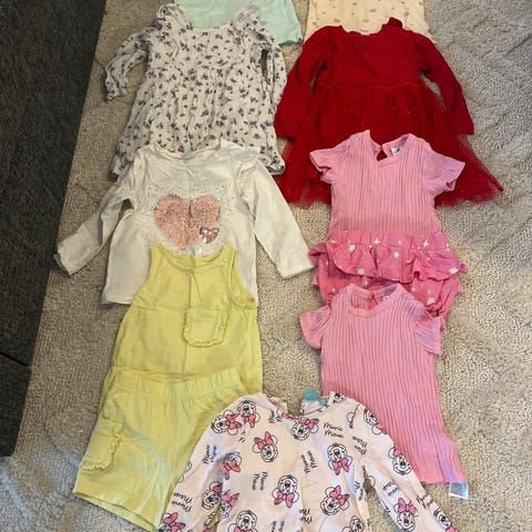 Fin pakke til jente. Noen flekker på bodyer eller klærne er hele. Får jakke på siste bilde gratis. Sikkert går å vaske burt flekkene ikke prøvd.