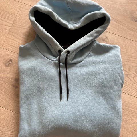 H&M hoodie i størrelse M i lys, dus grønn/beige tone med hette og snøring. Diskré tekst/logo i front gir et rent uttrykk.