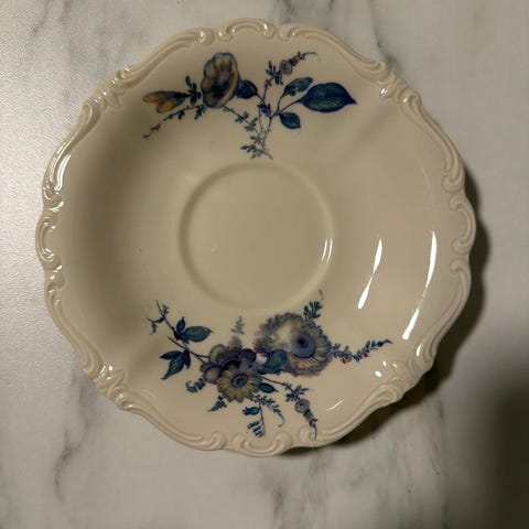 Hvit bunnfarge med flerfargede blomster og profilerte kanter. Egner seg til servering av kaffe, te og kaker, samt som dekorerende servise til borddekking.
