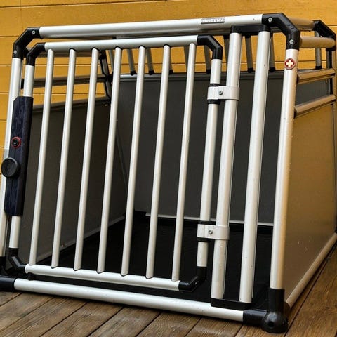 Bilbur til hund fra Trønderbur i metall med mål ca. 51 cm bredde, 57 cm dybde og 62 cm høyde. Buret har solid ramme i metall og nettingdør i front med lås. Egnet som oppholds- eller transportbur for mellomstore hunder, avhengig av hundens størrelse og behov.