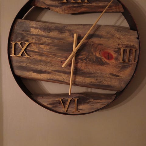 Veggur i tre med pendel. Klokken har rundt, hvitt urskive med svarte tall og visere, samt gyllen kant rundt urskiven. Midtseksjonen har glassdør som viser pendelen. Nederst er det et skap med tredør for oppbevaring. Klokken er egnet som innredning i stue, gang eller andre oppholdsrom der man ønsker et tradisjonelt veggur i tre.