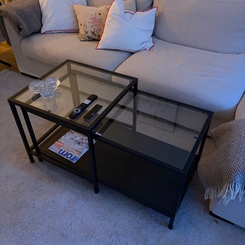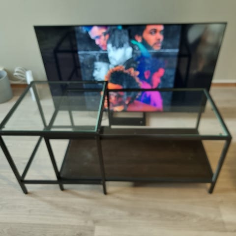 Stuebord i glass med et lite bord under som kan flyttes! Ca. 120 på det lengste punktet.