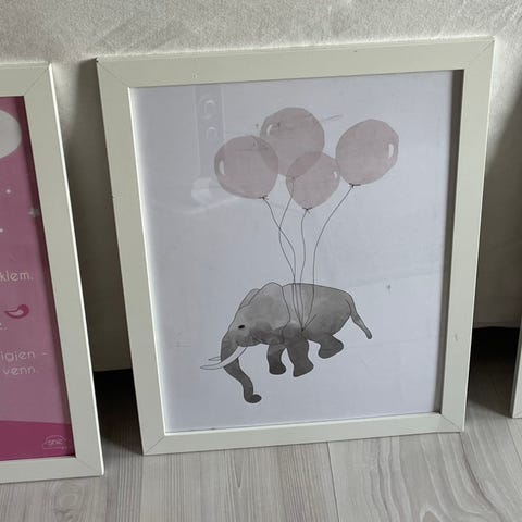 To veggbilder til barnerom med motiv av luftballong og luftskip med dyr om bord. Bildene har dempede, nøytrale farger som beige, grå og dus rosa/oransje. Formen følger motivet (utskåret rundt konturene), og de er laget som lette dekorplater som kan henges på veggen. Passer som veggdekor på barnerom eller lekerom. Selges for 80kr + frakt :)
