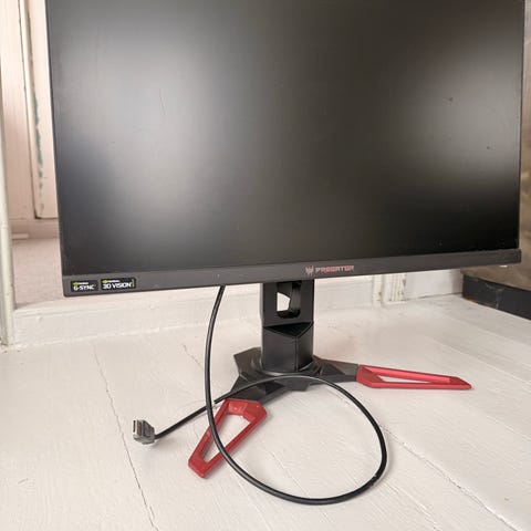 Acer 24" skjerm. Skjermen har 24 tommers bildeflate og er utstyrt med Nvidia G-Sync og Nvidia 3D Vision-støtte, egnet for bruk med kompatible PC-er og grafikkort. Leveres med strømkabel/tilkoblingskabel slik det fremgår av bildene.