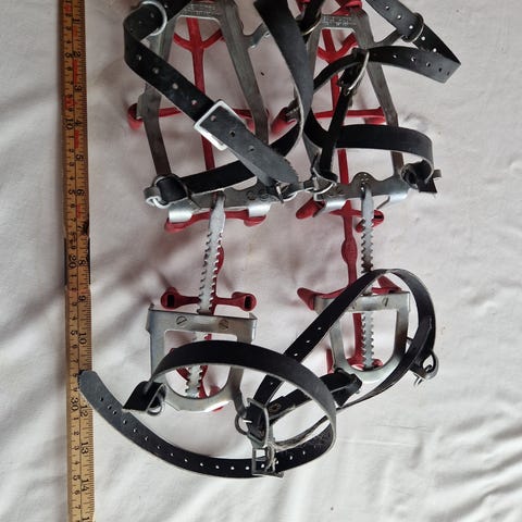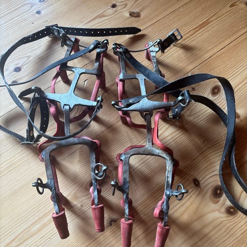 Justerbar lengde med tannstang og skruer gjør at de kan tilpasses ulike skostørrelser. Festes rundt sko eller støvler med remmer og spenner.