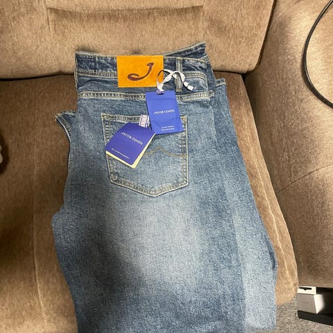 Jacob Cohën Bard jeans for herre i blå denim. Buksen har livvidde W31. Klassisk 5-lommersmodell med knappelukking og karakteristiske Jacob Cohën-detaljer, som brodert J-logo på myntlommen og Bard-betegnelse ved knappene. Innvendig har buksen mønstret fôr og merkelapper med tekst. Egnet som hverdagsbukse eller til mer pene, uformelle anledninger.