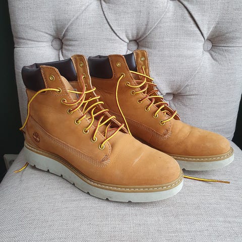Klassiske Timberland boots i lys brun nubuck selges. Skoene er nylig pusset og behandlet med fett tilpasset Timberland, så læret er godt ivaretatt og mykt.