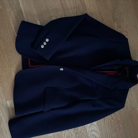 Zara blazer for dame i størrelse M. Blazeren er grønn og laget i polyamidblanding med strukturert overflate. Den har dobbelspent lukking med metallknapper foran og krage med markert kant. Modellen er kort i fasongen og har helfôret innside i lys tekstil. Egner seg til bruk over topp, skjorte eller kjole i hverdagen eller til mer formelle anledninger.