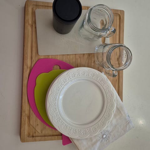 Fat, skåler, bestikk, vannkoker, plastblomster