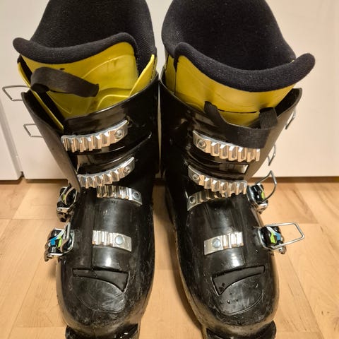 Alpinstøvler i størrelse 245 mm (sålelengde 285 mm). Støvlene er svarte med gule detaljer og har flere justerbare spenner i metall. Polstret innersko gir støtte og komfort. Egnet som alpinstøvler for barn eller mindre føtter til bruk i alpinbakke.