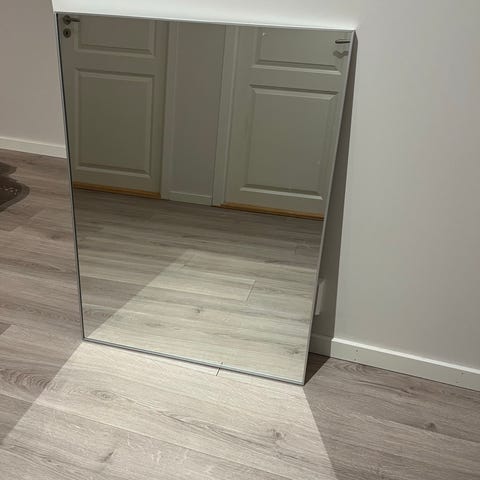 IKEA speil med tilhørende veggfester. Rektangulær speilplate med bakplate og monteringsbeslag/skruer som vist på bildene.