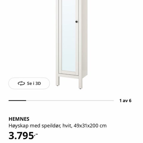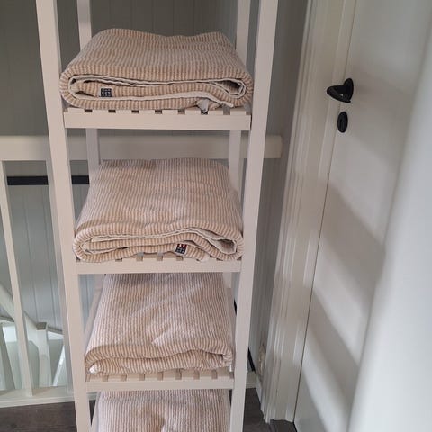 Hvit hylle med flere nivåer. Hyllen er smal og høy, med åpne hyller som gir god oversikt over innholdet. IKEA hemnes hylle for baderom