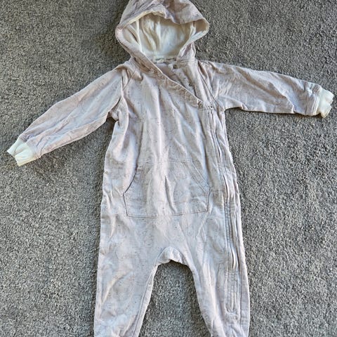Ensfarget heldress med hette, lomme på magen, trykknapper fra halsen og ned til venstre side og glidelås fra brystkassen og ned til venstre fot. Motiv av vaskebjørner og kvister med blader, kongler og bær. Meget pent brukt, som ny.