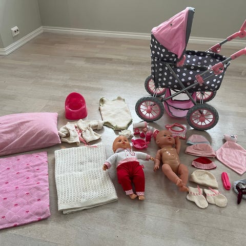 Dukkeseng, dukkevogn, baby born dukke og flere andre dukke med tilbehør.