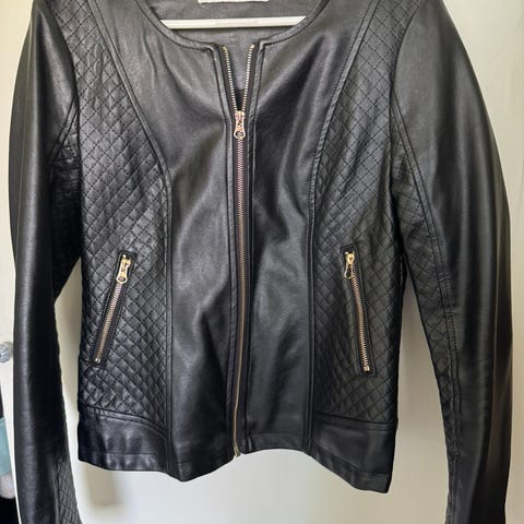 100% skinn jakke med gull detaljer . Jakken har lommer og glidelås lukking.