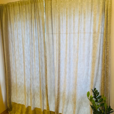 Selger et sett med pene, beige gardiner i god kvalitet. Lite brukt og i veldig fin stand, ingen flekker eller skader.