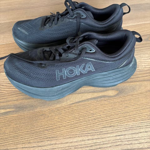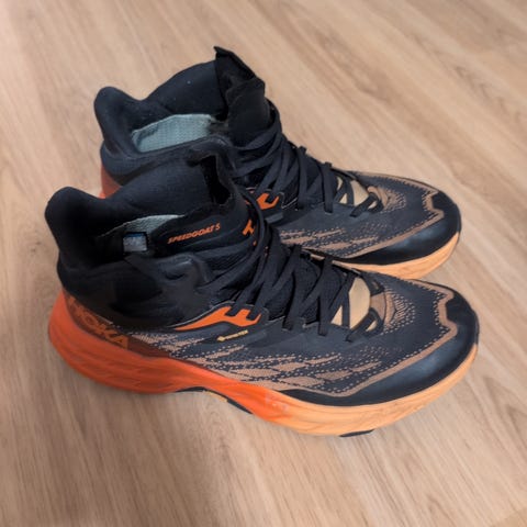 Hoka Speedgoat 5 GTX løpesko i størrelse 42. Modellen er en terreng- og løpesko med Gore-Tex-membran og grov yttersåle med knotter for godt grep på variert underlag. Skoene har overdel i syntetisk materiale og mesh, og mellomsåle med demping tilpasset løping. Farge: svart med detaljer i blått. Egnet til løping og turbruk på sti og annet ujevnt underlag.