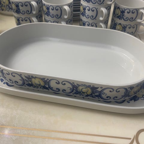 Villeroy & Boch kopp og skål i porselen med hvit innside og rødt mønster på utsiden av koppen samt på skålen. Settet på bildene viser kopper med høyde på ca. 8–9 cm og diameter på ca. 7–8 cm. Passer til kaffe, te eller andre varme drikker. Klassisk form med hank og tilhørende asjett/skål i samme dekor. Egnet til bruk på kjøkken eller spisebord som del av et servise i porselen.