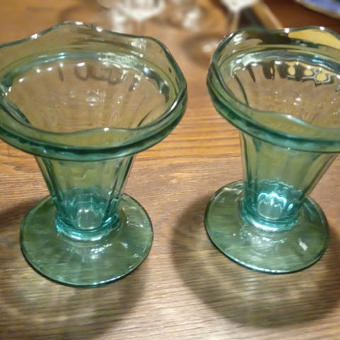 Glass dessertskåler på stett i klart glass. Settet består av fem skåler med riflet mønster i glasset og bølget kant øverst. Skålene egner seg til servering av dessert, is, frukt eller småsnacks. Klassisk form med fot som gir stabilitet på bordet. Passer både til hverdagsbruk og til enklere selskapsdekking. Samlet pris 200 kr